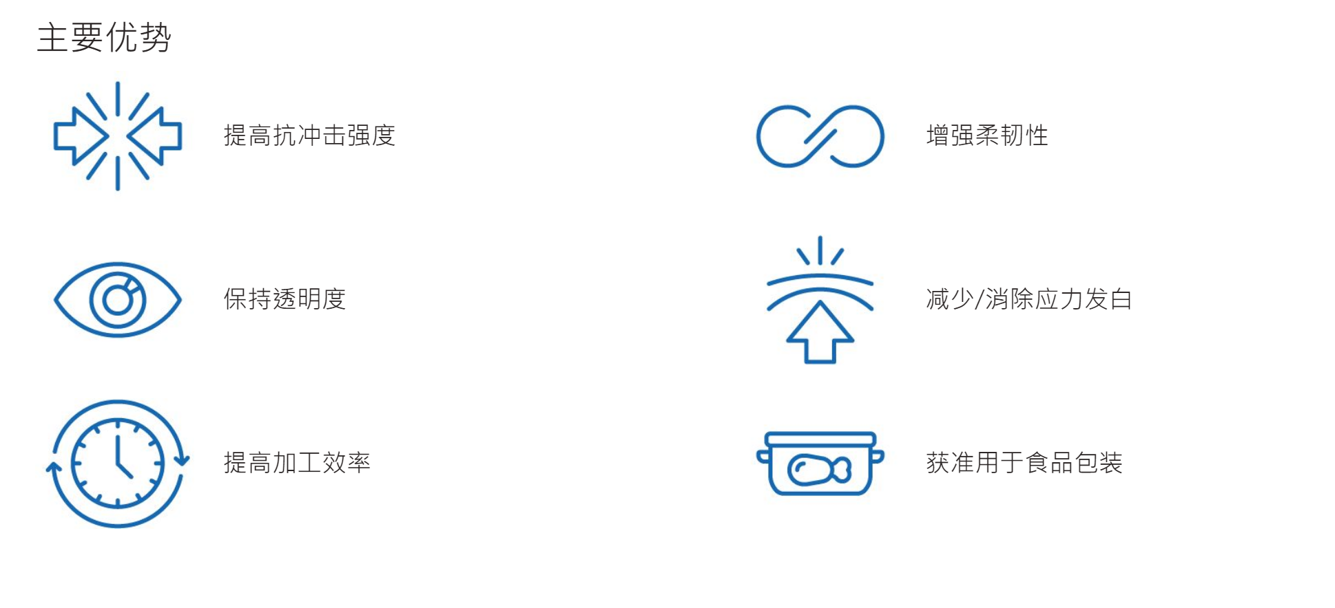 威達美?高性能聚合物與聚丙烯混合時可為您提供經濟高效的包裝解決方案。應用和優勢:提高了抗沖擊強度、增強柔韌性、保持透明度、無需更換現有設備、獲準用于食品包裝、提高加工效率。